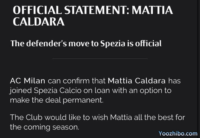 篮球直播吧07月18日讯 AC米兰官方消息,球队后卫卡尔达拉租借加盟斯佩齐亚,租期一年。