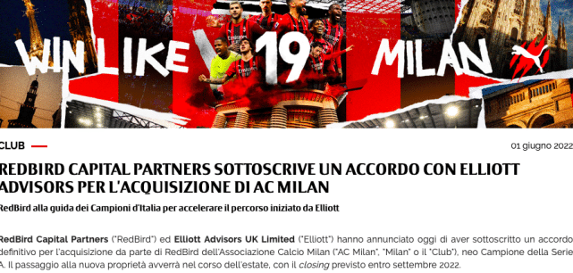 近5年第3次易主!AC米兰官宣美国红鸟资本收购球队,交易估值12亿欧