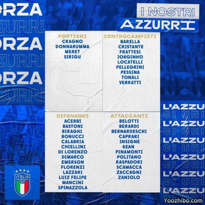 后卫:阿切尔比(拉齐奥)、巴斯托尼(国米)、比拉吉(佛罗伦萨)、博努奇(尤文)、卡拉布里亚(米兰)、基耶利尼(尤文)、迪-洛伦佐(那不勒斯)、迪马尔科(国米)、埃莫森(里昂)、弗洛伦齐(米兰)、拉扎里(拉齐奥)、路易斯-费利佩(拉齐奥)、吉安卢卡-曼奇尼(罗马)、斯皮纳佐拉(罗马)