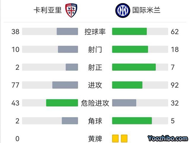 全场比赛结束,最终国际米兰3-1击败卡利亚里,仍距榜首的AC米兰2分。