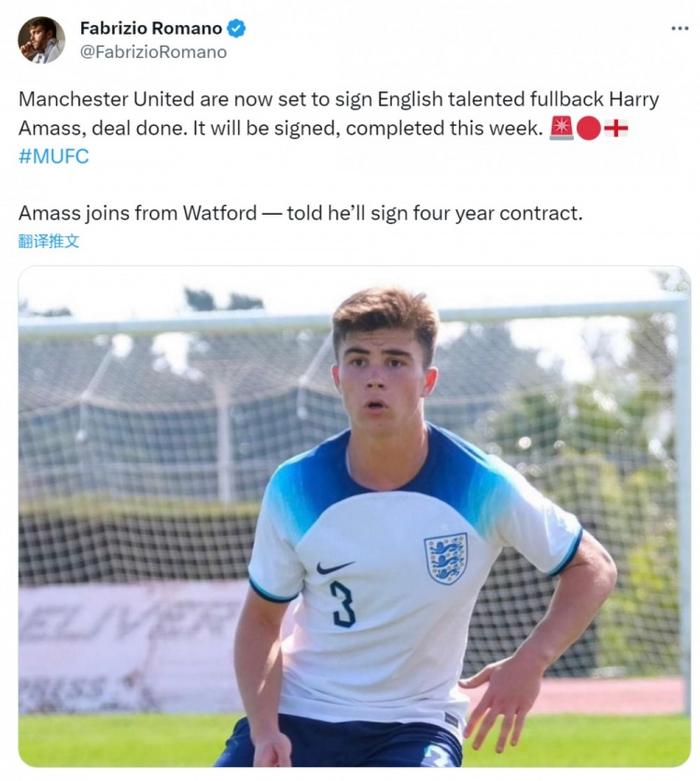 篮球直播吧讯06月27日据The Athletic报道,曼联已经同意签下沃特福德的16岁的左后卫哈里-阿马斯。