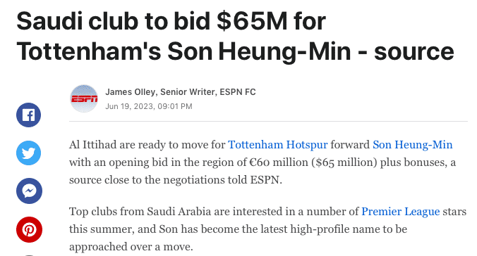 联袂本泽马?曝沙特联赛冠军6千万报价孙兴慜!开4年1.2亿欧薪水