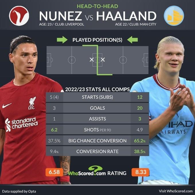 篮球直播吧10月15日消息,本轮英超曼城将迎战利物浦,数据网站whoscored对比了努涅斯和哈兰德两名新人中锋的数据。