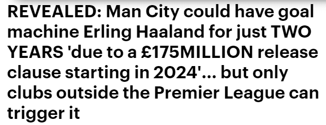 这个高达2亿欧(1.75亿英镑)的违约金2024年夏天生效,但曼城的英超对手无法激活,因为它只对英超以外的俱乐部生效,皇马和巴塞罗那届时有可能行动。
