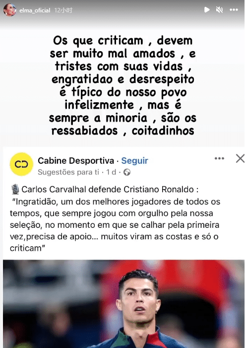 另一个姐姐Elma也声援C罗,怒斥那些批评自己弟弟的人们是对他们的生活感到悲伤、不尊重,是“可怜的东西”。