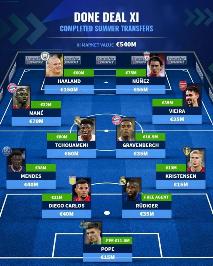 篮球直播吧06月26日讯 目前,夏窗已经打开,德国《转会市场》列出夏窗已宣最佳阵,哈兰德、马内领衔领衔。