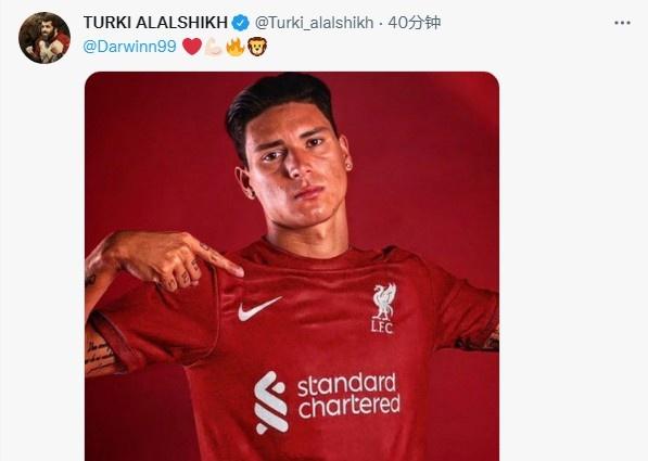 今日,阿尔梅里亚俱乐部老板TurkiAlalshikh发文,并且配了一张努涅斯身穿利物浦球衣的图片,表示祝达尔文-努涅斯未来好运。
