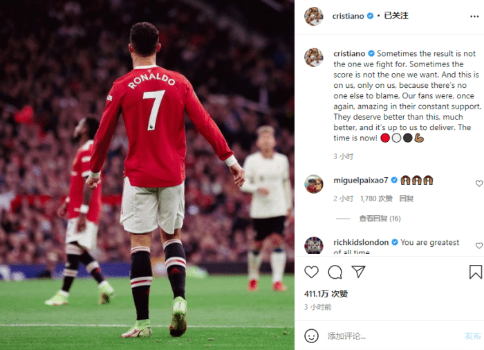 C罗写道:“有时候比赛结果不是我们想要的,有时候比分不是我们想要的,这是我们的责任,只能是我们的责任,因为你无法责怪其他人。”