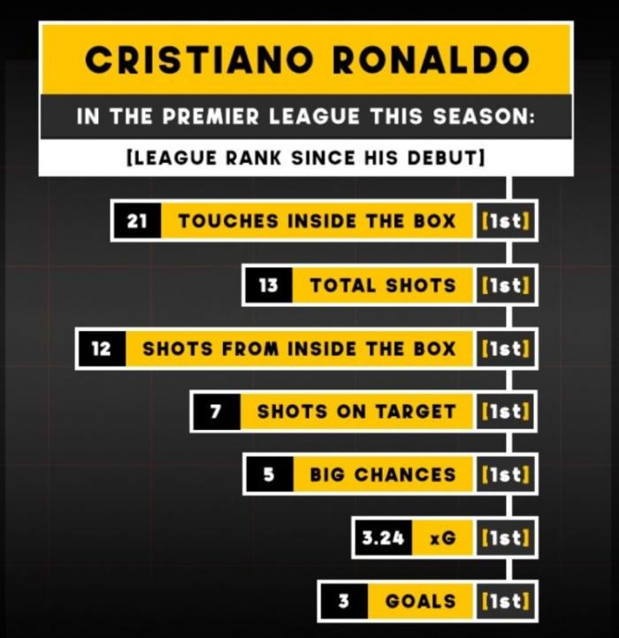 独一档?C罗回归曼联后,七大数据位列英超第一!