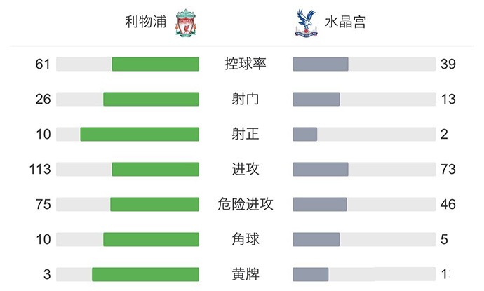 伤停补时3分钟。全场比赛结束,利物浦3-0水晶宫。