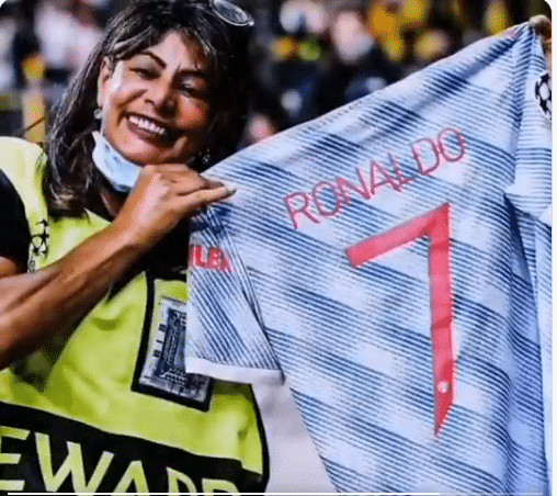 C罗立即走到球门后表示歉意,还送给她一件自己的曼联7号客场球衣,她开心地展示了这件球衣。