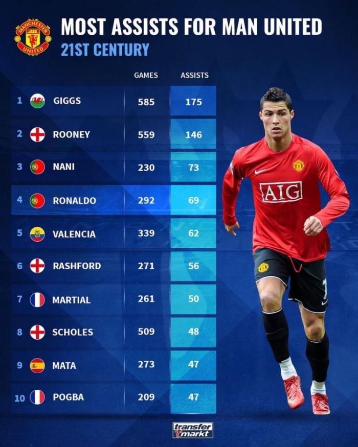 曼联本世纪助攻榜:吉格斯榜首,C罗第四,现在曼联队内五人上榜!