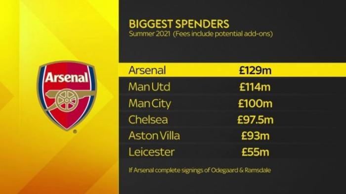 篮球直播吧讯 由于阿森纳即将签下厄德高和拉姆斯代尔,因此,有媒体统计,如果加上这两笔交易的转会费,阿森纳今夏的转会支出将达到1.29亿英镑,位列英超球队第一。