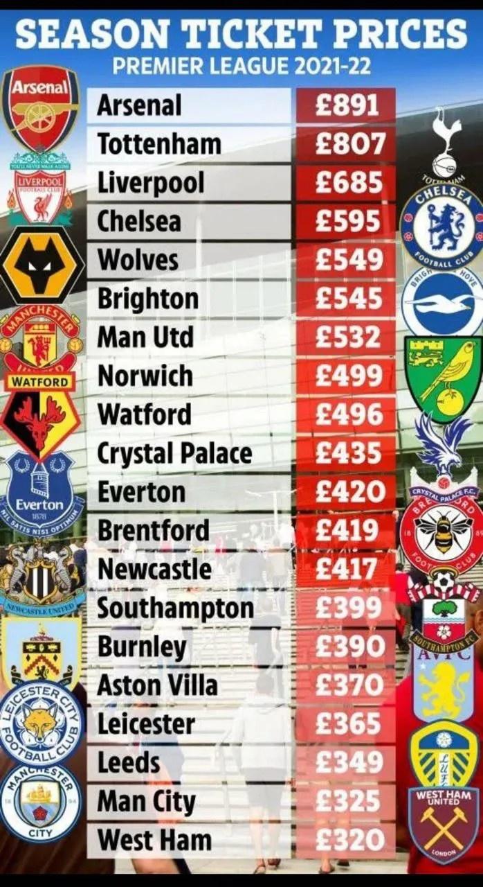 阿森纳和热刺的季票都在800英镑以上,而第三的利物浦就少了很多,他们季票的价格只有685英镑,而排名第四的是切尔西,切尔西季票价格是595英镑,第五是狼队的549英镑,第六是布莱顿的545英镑。而英超豪门曼联的季票只有532英镑。随后是诺维奇的499英镑,沃特福德的496英镑,水晶宫的435英镑,埃弗顿的420英镑,布伦特福德的419英镑,纽卡的417英镑,南安普顿的399英镑,伯恩利的390英镑,维拉的370英镑,莱斯特城的365英镑,利兹联的349英镑,曼城的325英镑和西汉姆的320英镑。
