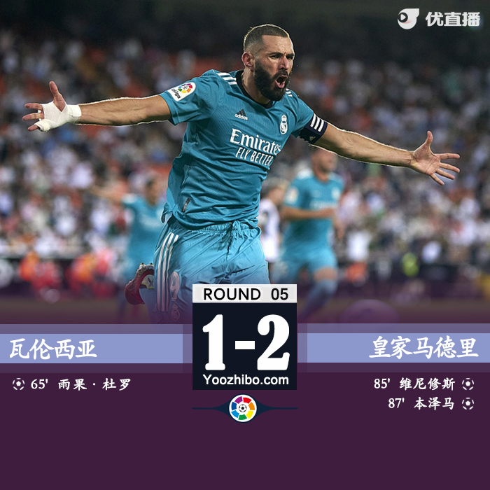篮球直播吧9月20日讯 北京时间09月20日星期一03:00,西甲第5轮瓦伦西亚对阵皇家马德里。上半场,瓦伦西亚23分钟连伤两人,索莱尔、科雷亚先后因伤下场,卡瓦哈尔也因受伤被换下,皇马半场0-0瓦伦西亚。下半场,杜罗弑杀旧主,维尼修斯85分钟扳平,本泽马88分钟绝杀,两人三分钟互相传射。最终,皇马绝杀2-1逆转瓦伦西亚。