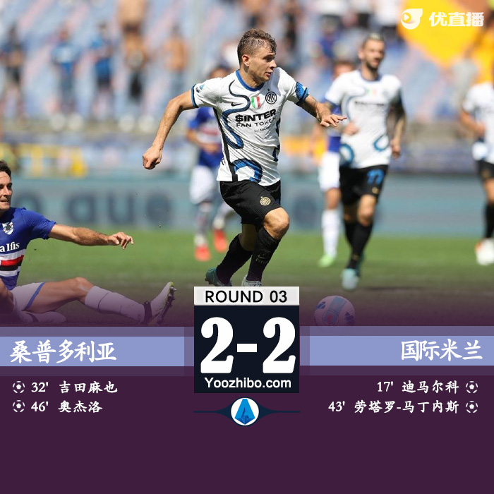 篮球直播吧9月12日讯 北京时间9月12日18:30,意甲联赛第三轮,国际米兰客场挑战桑普多利亚。上半场劳塔罗为国米赢得任意球机会,迪马尔科主罚命中,随后桑普多利亚利用一次角球机会由吉田麻也扳平比分,上半场尾声阶段劳塔罗凌空垫射破门,国米暂2-1桑普;下半场刚开场,奥杰洛爆射进球,随后两队再无建树,最终国米2-2战平桑普多利亚。