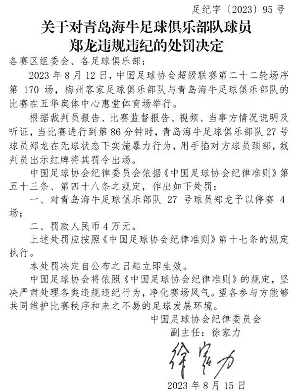 来源:篮球直播吧08-16 17:13篮球直播吧08月16日讯,中国足协再次开出重磅罚单,效力于中超升班马青岛海牛队的35岁前国脚郑龙,因为锁喉推倒对手外援,被停赛4场并且罚款4万元。